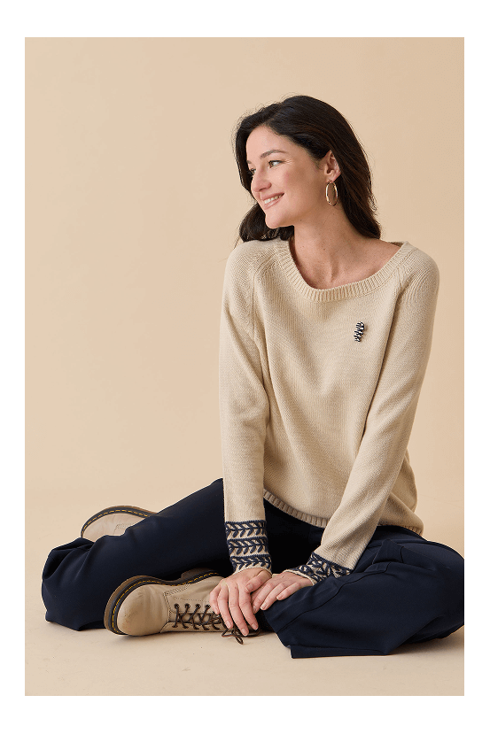 Coupe classique, col rond, manches longues. Pull 100% coton avec intérieur brossé pour plus de confort.